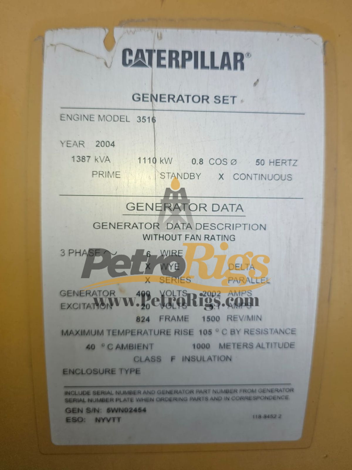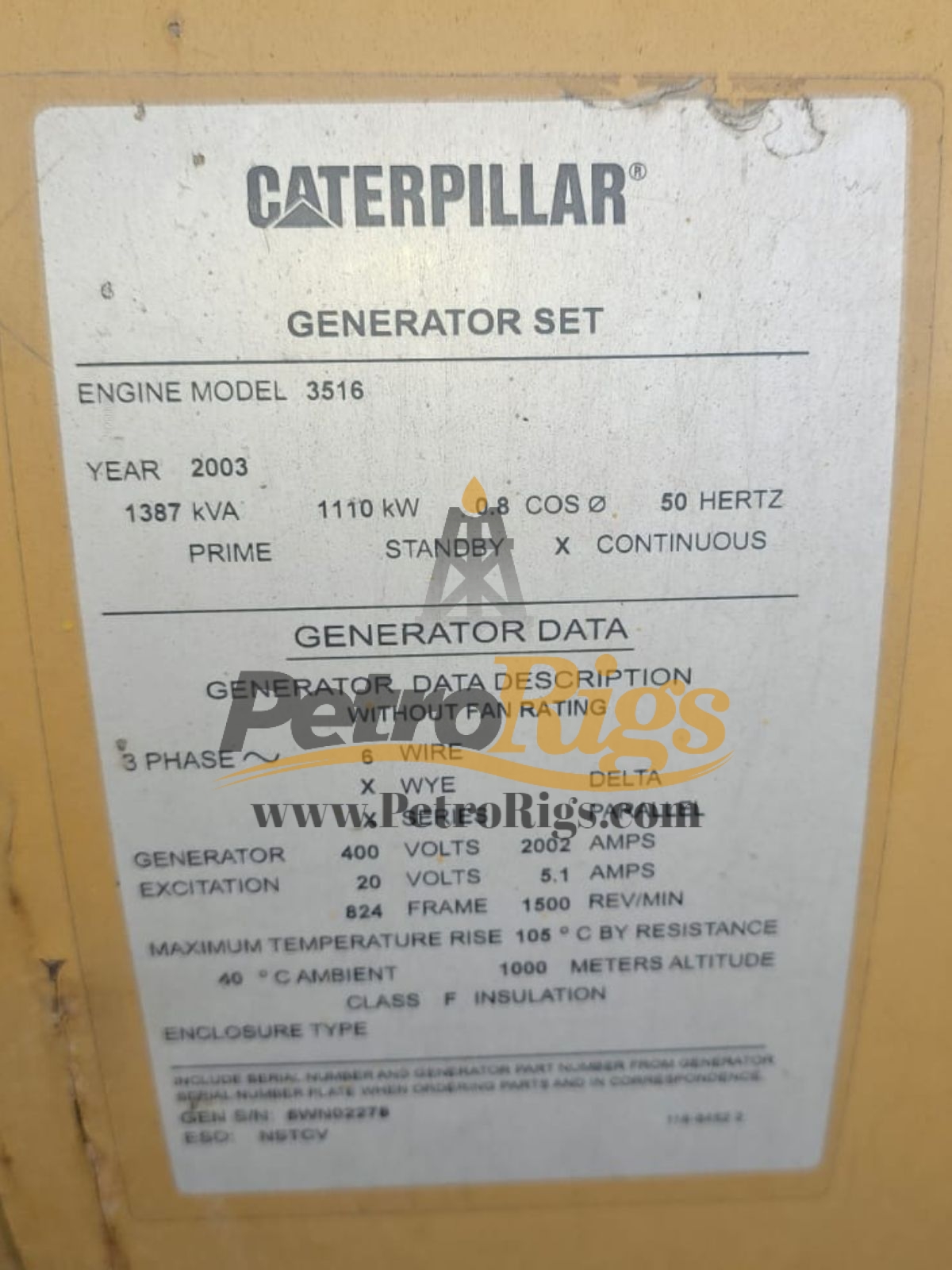 Two (2) Caterpillar 3516 1110KW Diesel Gensets, only 15000 and 18000 hours on these. Key Specs: 1387KVA/1110KW, 3Phase, 1500RPM, 50HTZ, 400Volt/2002Amps. Serial Numbers: 5WN02454 (15000 hours) and 5WN02275 (18000 hours)