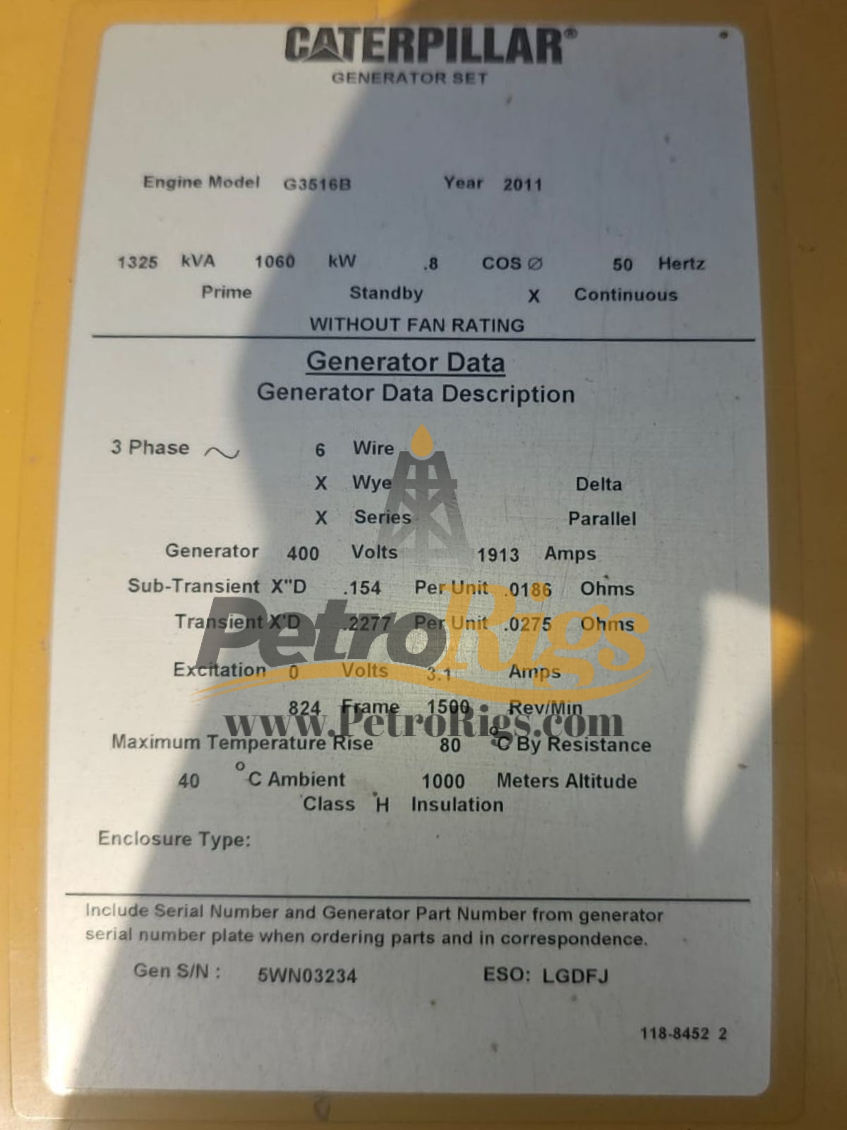 Low Hour Caterpillar G3516B Natural Gas Generator. Key Specifications: 1325KVA/1060KW, 3Phase, 400V/1913 Amps, 1500RPM, 50HTZ. Only 7500 hours on this genset.