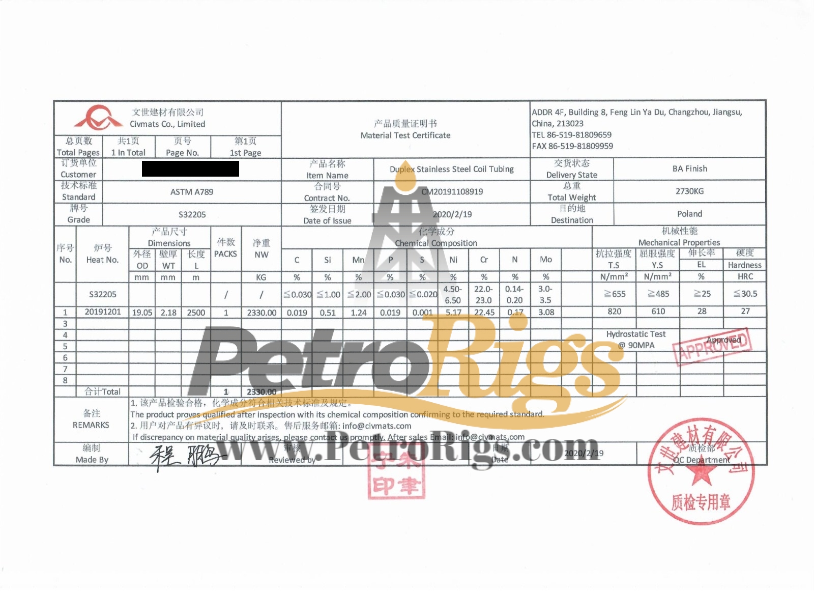 Un-Used Surplus New Duplex Stainless Steel Coil Tubing Hydraulic Control Line, 8200 feet (2500 meters) available on shipping spool. Dimensions: 19.05mm OD, 2.18mm WT.