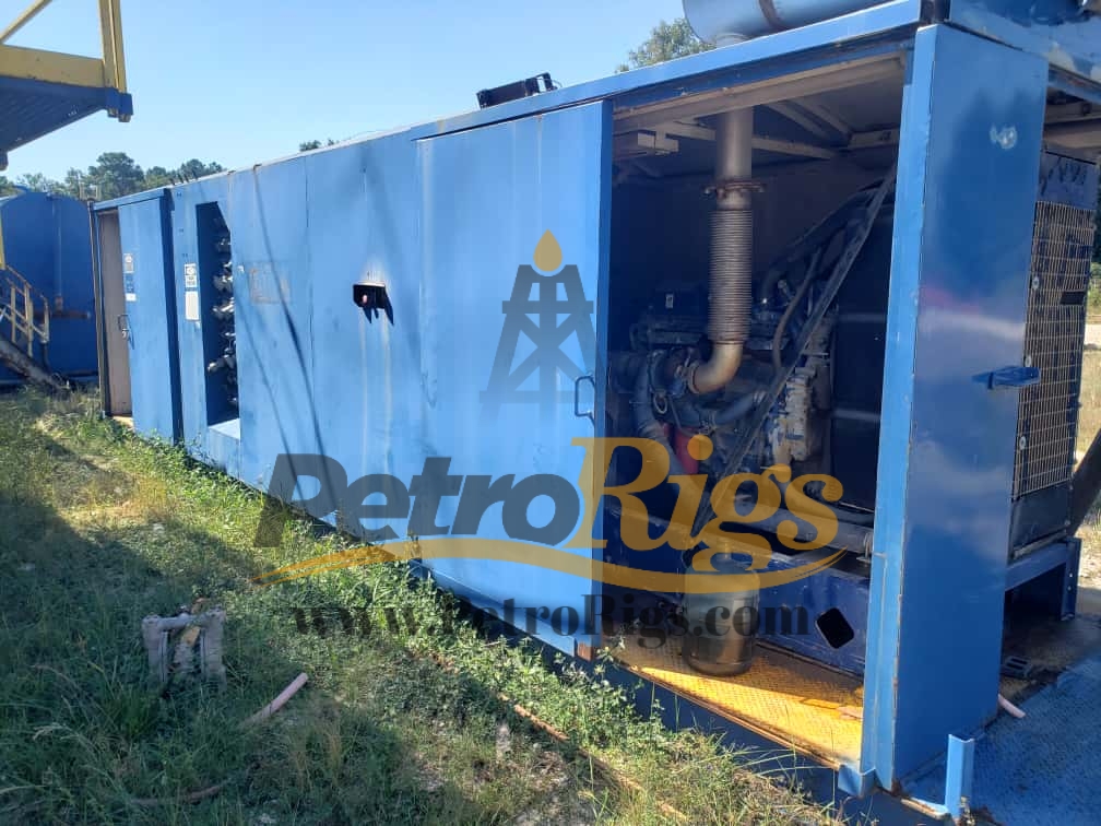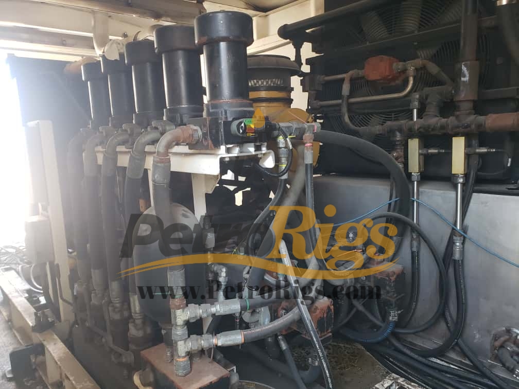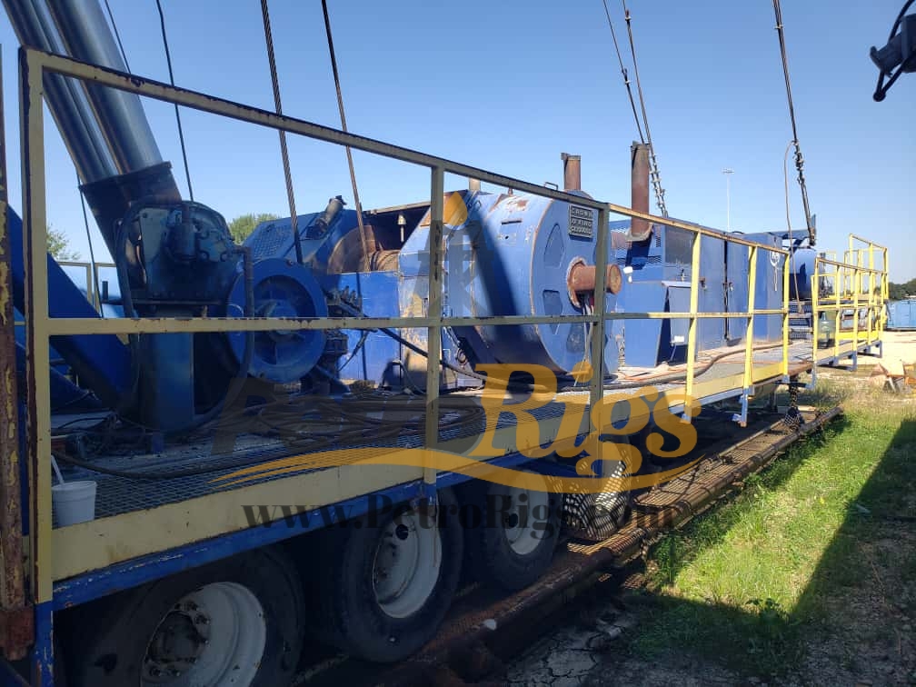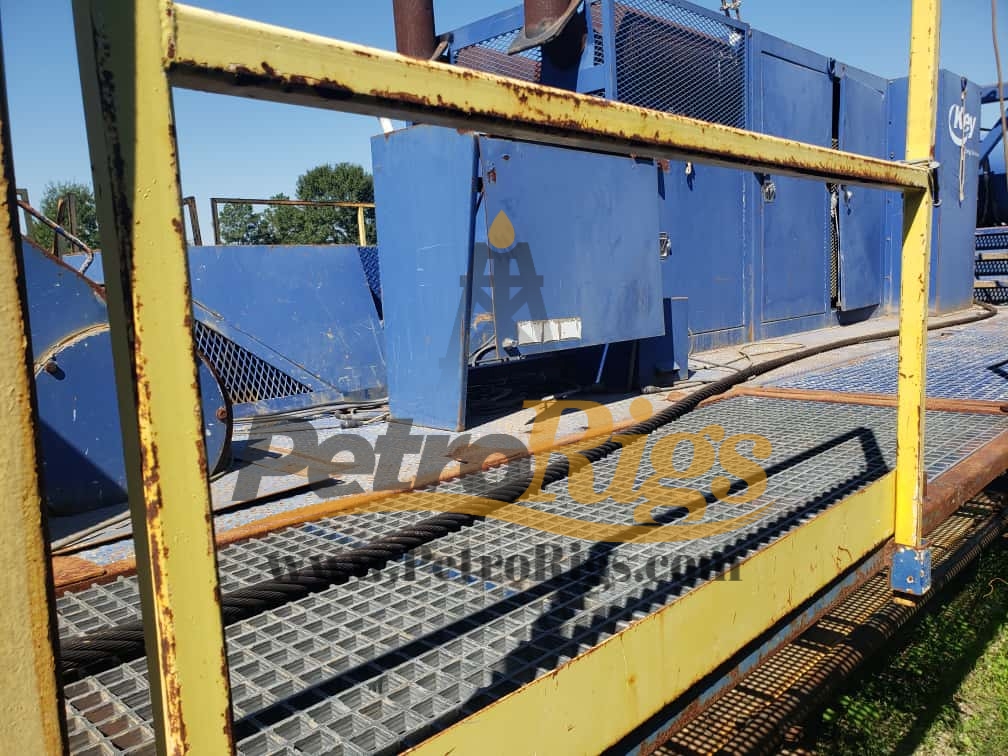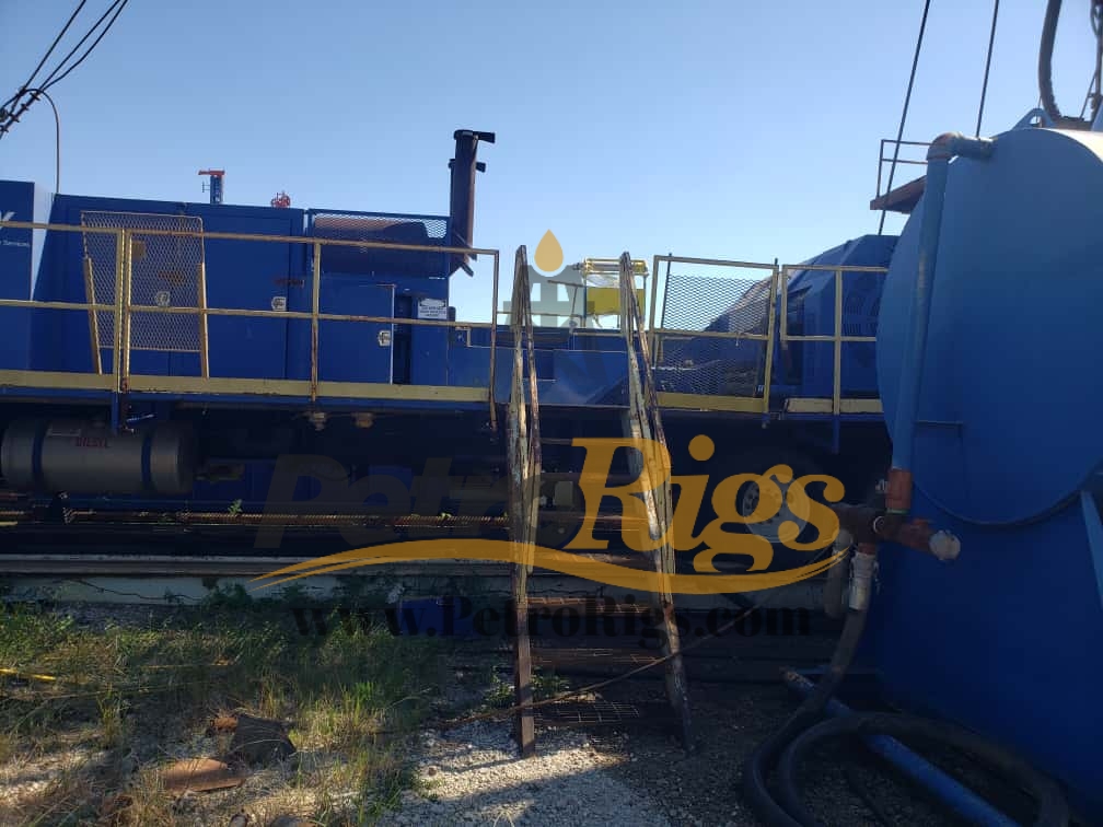 SPECS: CE1000 S/D Drawworks with LEBUS f/ 1-1/4″ Line w/ WPT Aux Water Brake, p/b DETROIT MTU 12V-2000 Diesel Eng, S/N-5352005701. ALLISON 6061 Transmission. 118’H 440,000# SHL Telescoping Mast w/ Dual Raising Cyls, Racking Board, 6-Sheave Crown Cluster, Warrior 250 ton Top Drive with HPU. AMERICAN Block w/ 5-Sheaves & Becket, Hyd Tong Cyls, Kelly Hose, 18″H x 28’L Pipe Rack, Mtd on 2010 STEWART & STEVENSON 4-Axle Back-In Trailer, VIN-1K9GF584XA1299002, w/ (4) Hyd Leveling Jacks, (2) Hyd Utility Winches, (2) 3-Stage Hyd Mast Raising Cyls., Deadline Anchor, Folding Walkways EA Side, 315/80R22.5 Tires