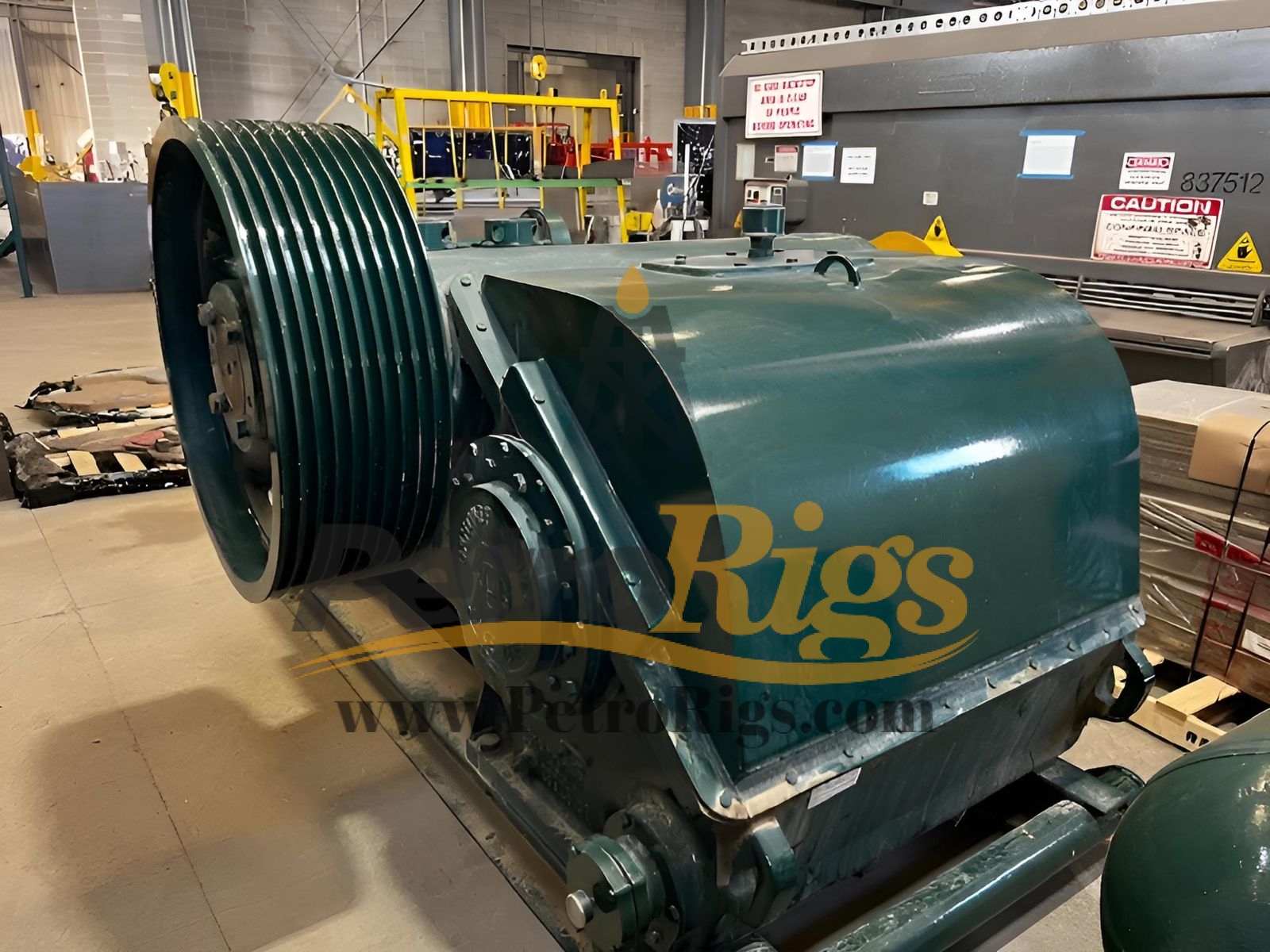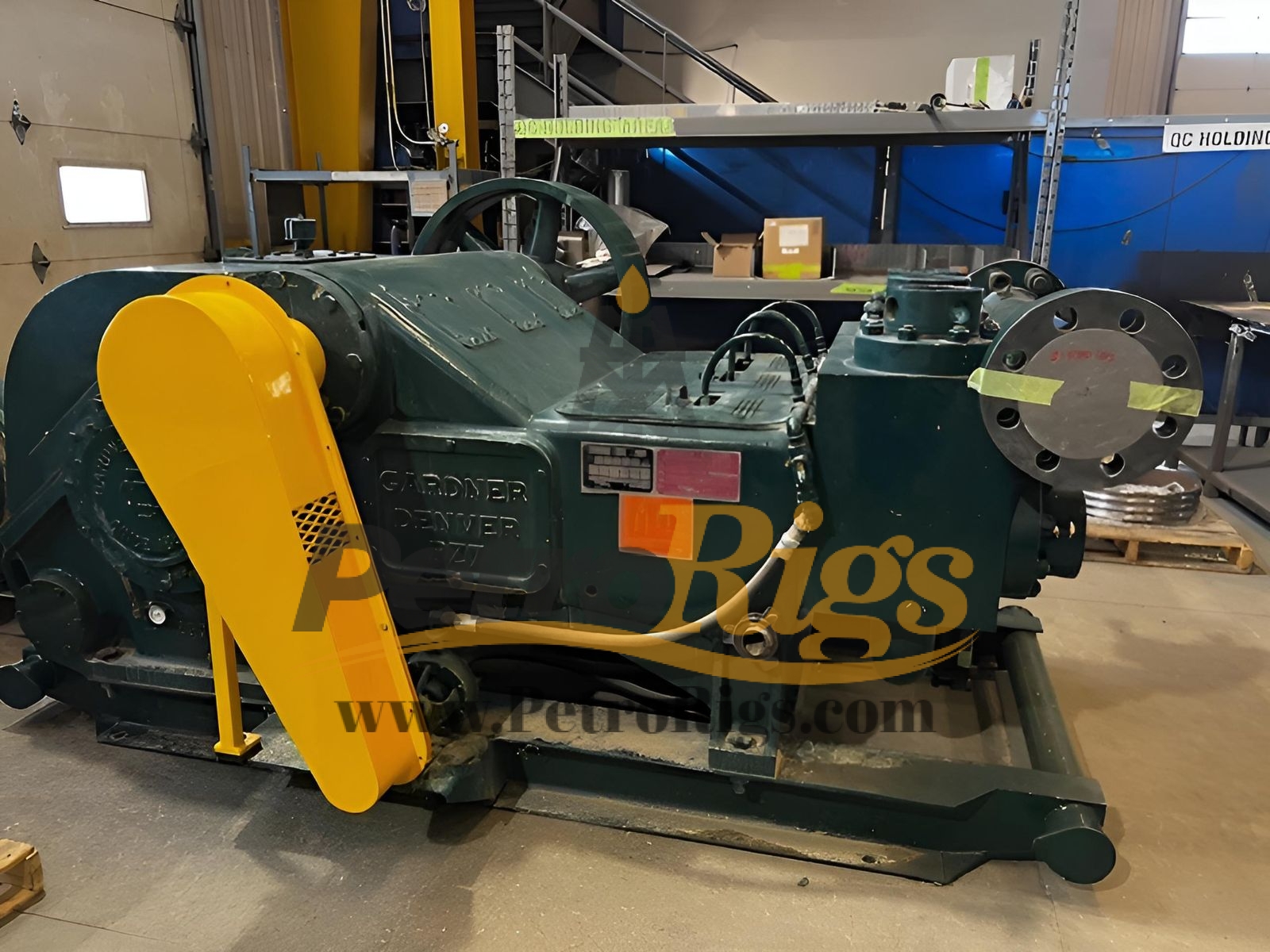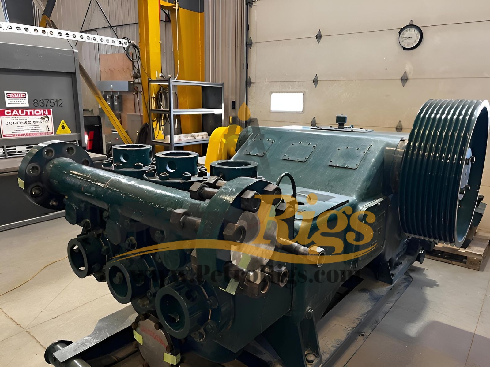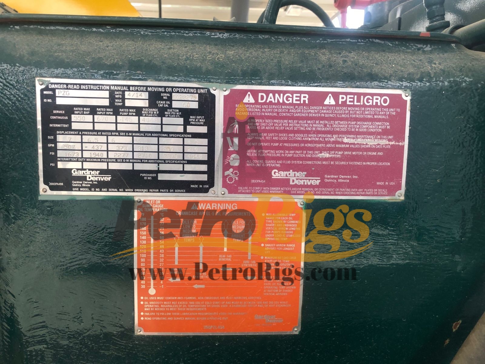 Un-Used Surplus NEW Gardner Denver PZ-7 550HP Triplex Mud Pump. Pump Specs: 550 BHP (410Kw) Maximum Input, 145 rpm, 7″ (178 mm) Stroke Length, 64000 lbs Piston Load, 4.625:1 Gear Ratio, 16765 lbs Pump Weight. This is an un-used loose pump with pulsation dampner.