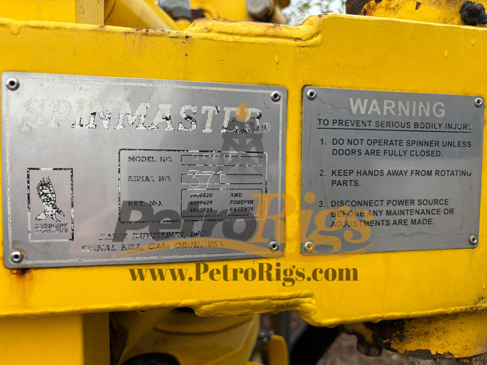 Two (2) Hawk Industries Hydraulic Spinmaster 950HJ Drill Pipe Power Spinners. Pipe Size Range 2.875” to 9.5“, Maximum Torque (ft-lb) 600 to 1972, Maximum Speed (rpm) 130 to 39, Weight (lbs) 575, Dimensions 22″ Width 36″ Depth 45″ Height.