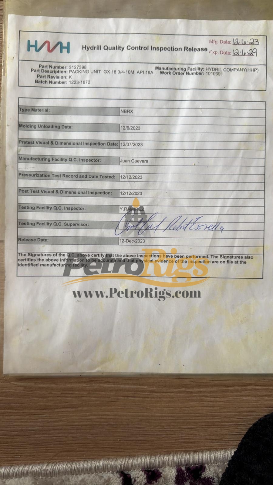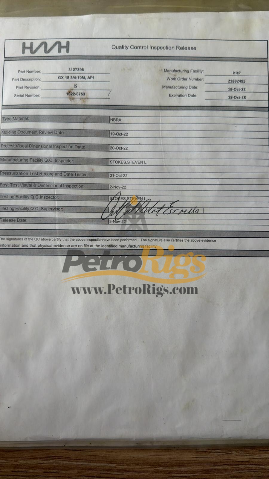 Un-Used Surplus NEW Hydrill GX 18 3/4” 10000 psi Packing Elements, Seven (7) available. HMHW KFDS Diverter 21” 1000 psi Packing Elements, Three (3) available. These are stored inside climate controlled warehouse and come with certificates.