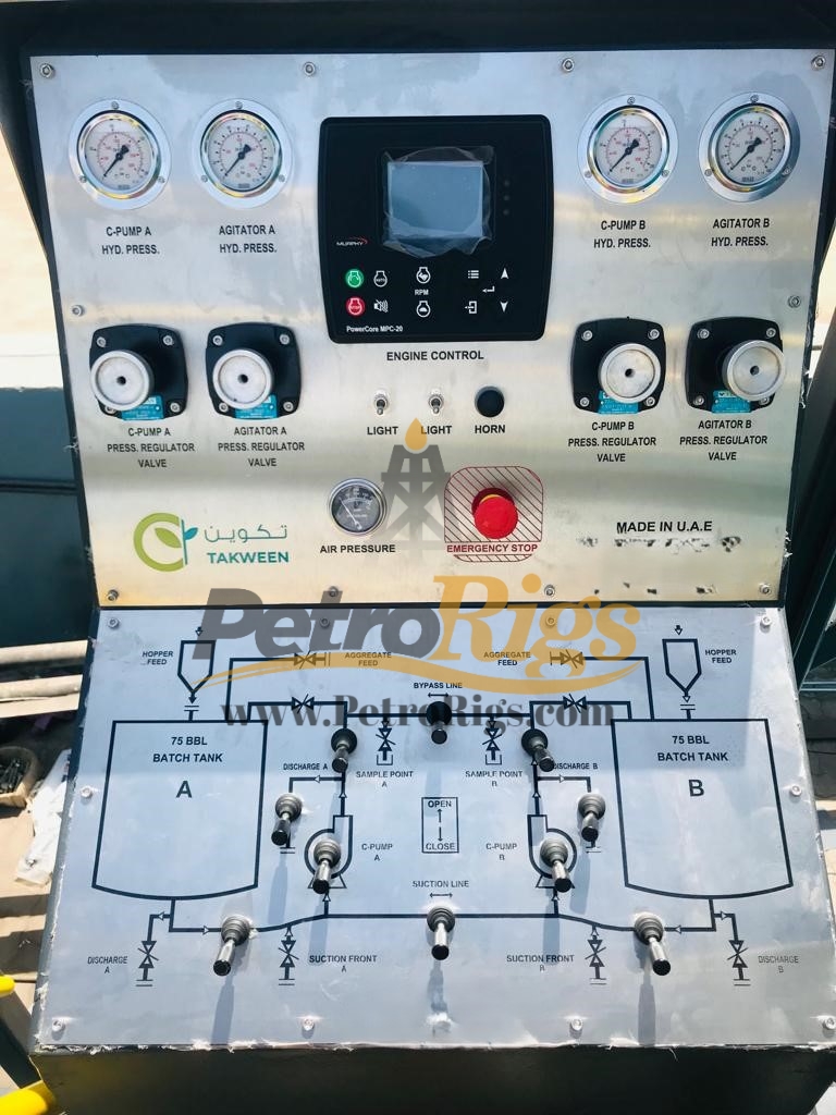 Brand New Offshore 150BBL Cement Batch Mixer. Skidded unit with CAT C9 Power, Two 75BBL Mixing Tanks, DNV Certified. Purpose-built manifold system is engineered to move water, acid, and dry bulk cement (or pre-mixed cement) to the batch mixer. It then blends the cement slurry/acid by recirculating the cement/acid through mixing tank(s) and then displaces the cement/acid to the cement/acid pumper.