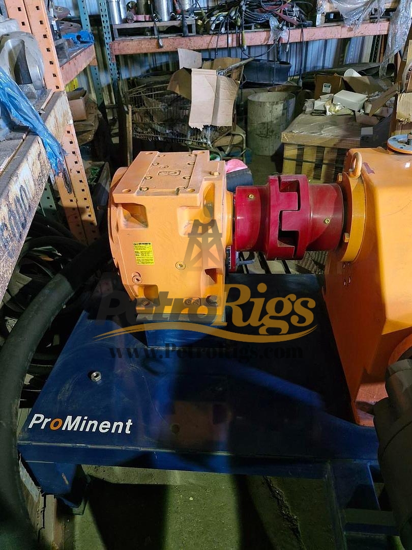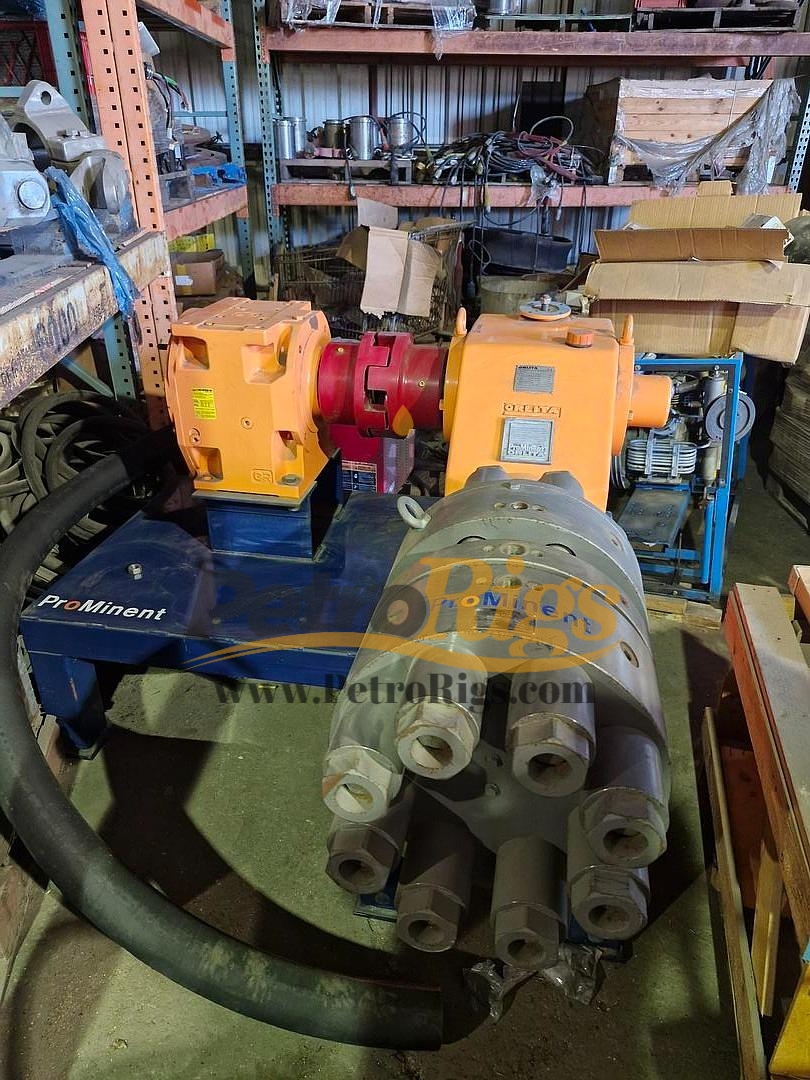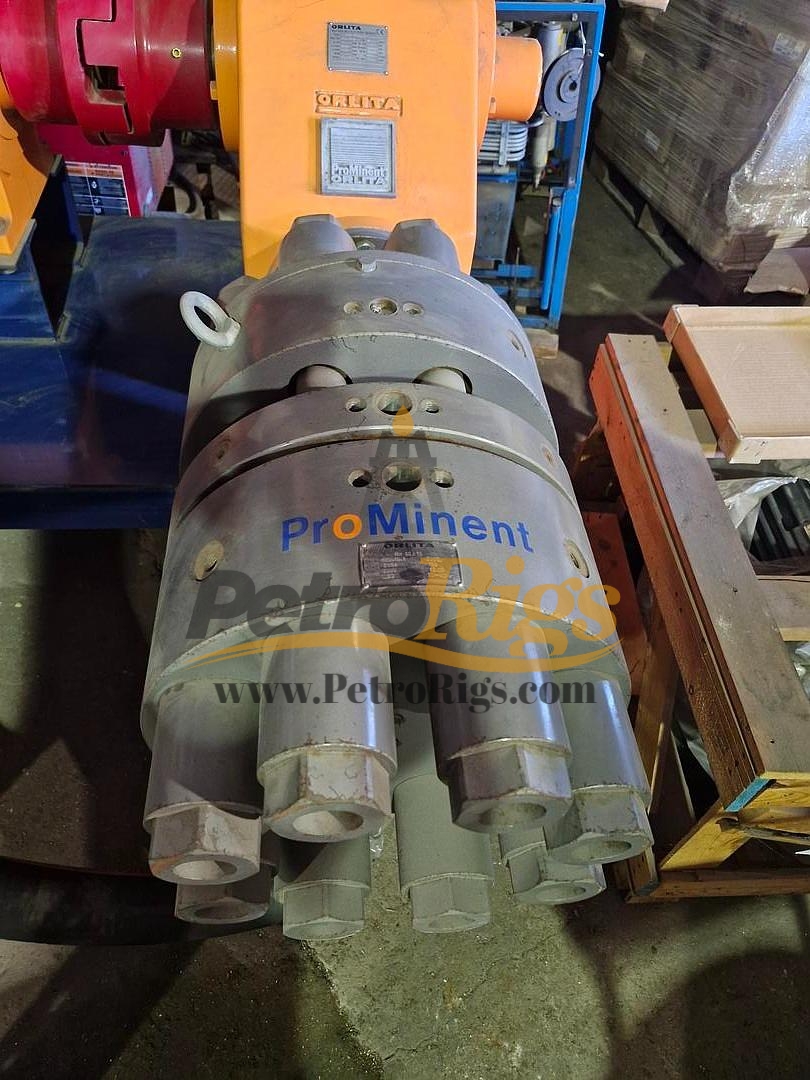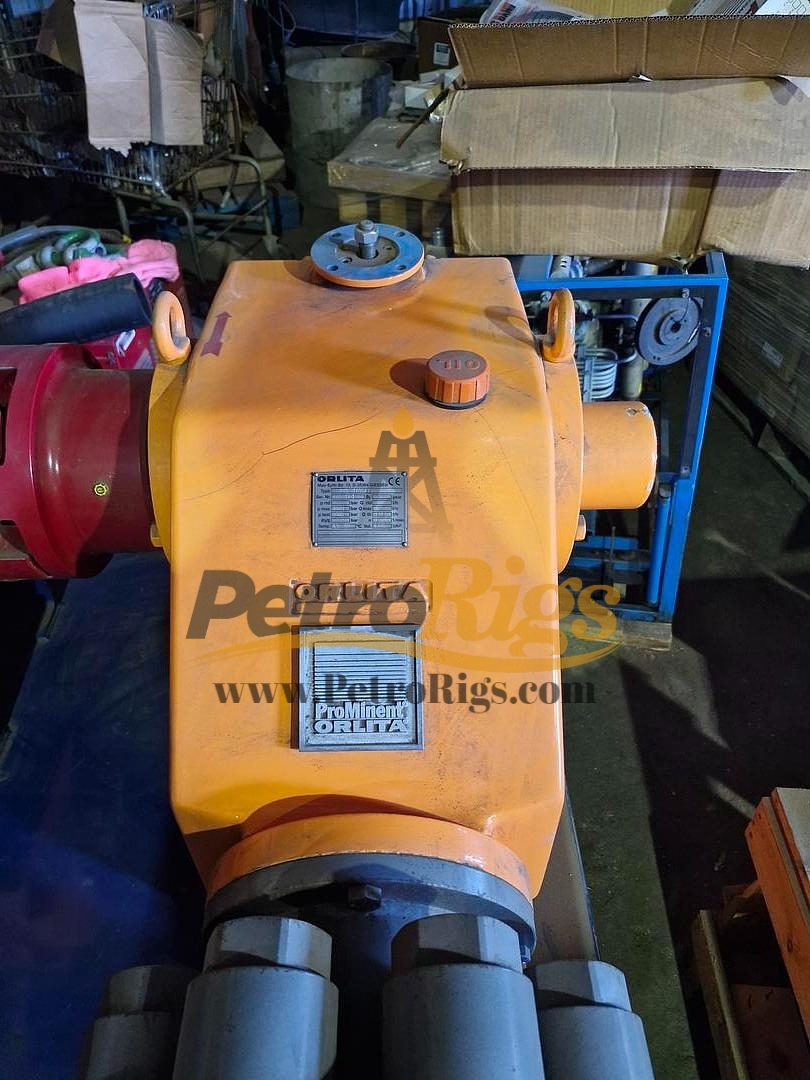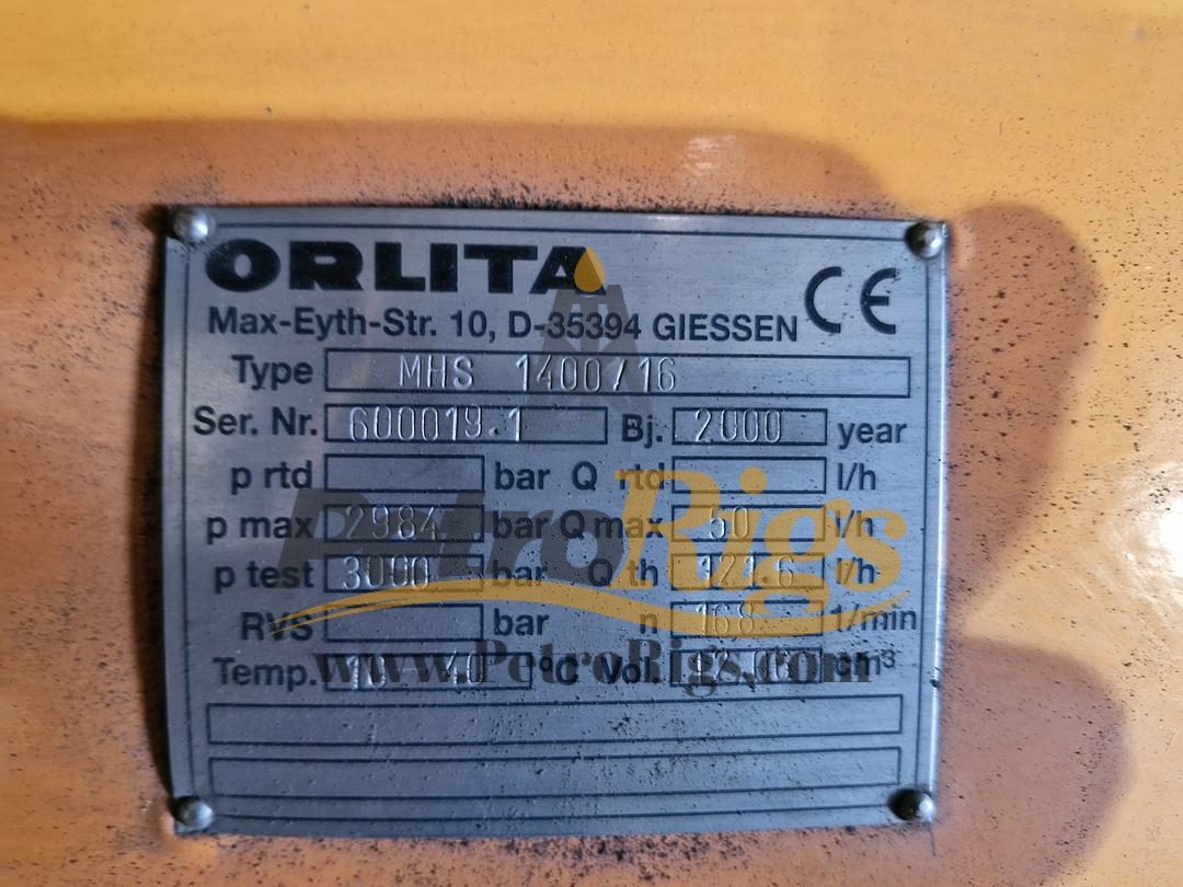 ProMinent ORLITA Ultra-High-Pressure Metering Pump. Model Type MHS 1400/16 (Gearbox) / MH 60/16 (Fluid Head). Serial Number 600019/1. Drive Setup Motor-driven high-torque gearbox connected via flex-coupling to the pump head. Extreme Technical Specifications Max Operating Pressure (P_max): 2,984 bar (~43,280 PSI), Factory Test Pressure (P_test): 3,000 bar (~43,500 PSI), Max Flow Rate (Q_max): 50 Liters per hour, Stroke Rate (n): 168 RPM.