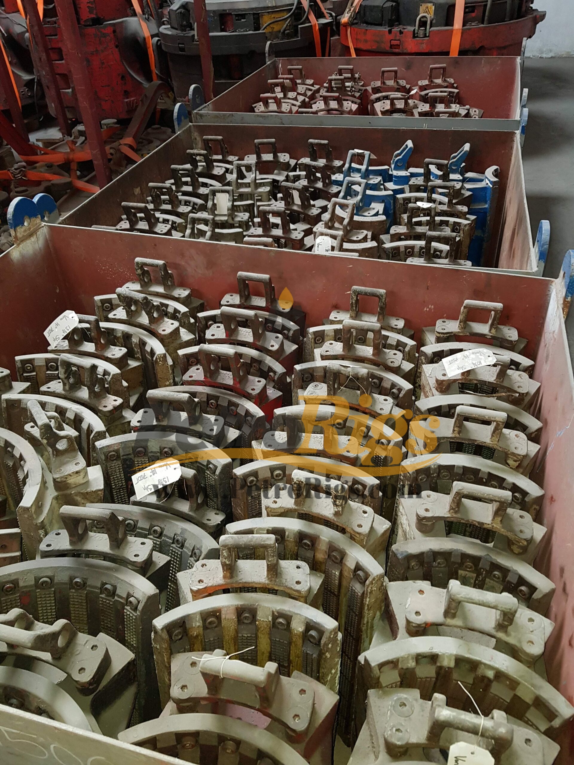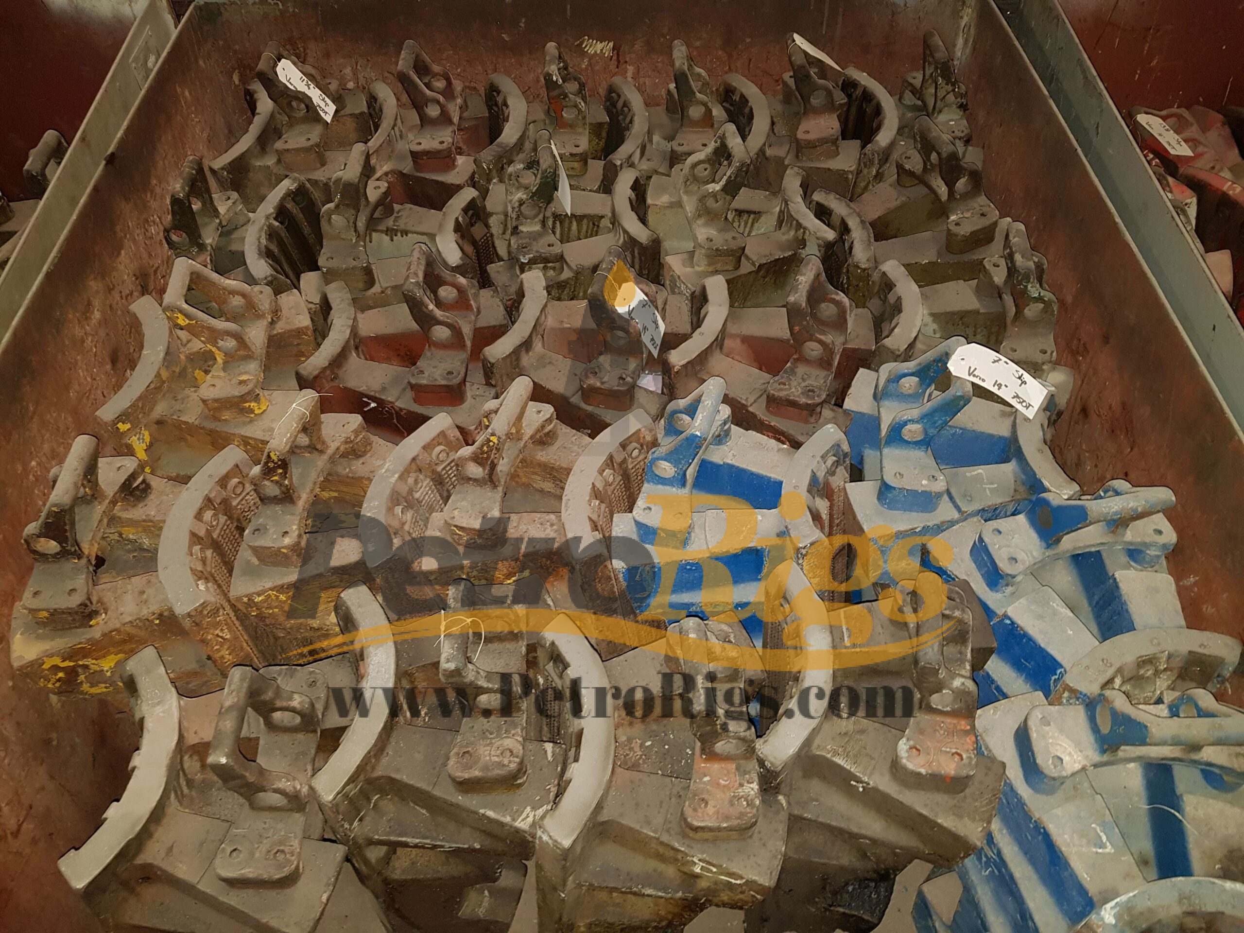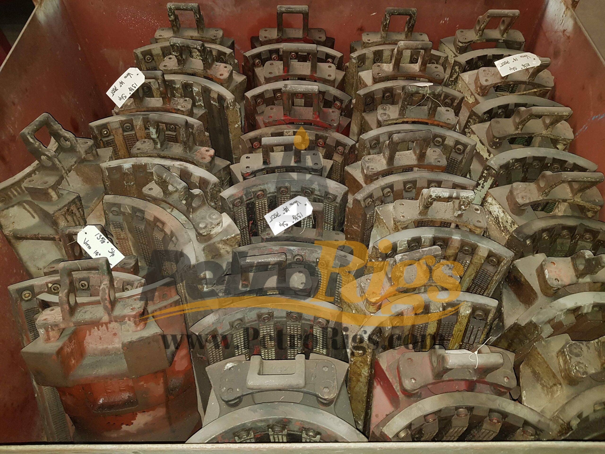 Six (6) Varco 14″ SL 750 Ton Elevator/Spider Bodies (P/N: 16150Y) available in Used (Good) condition. Twenty-Six (26) 750 Ton Slip assemblies available, Sizes 7″ up to 14″. Available as Package deal or Individually.